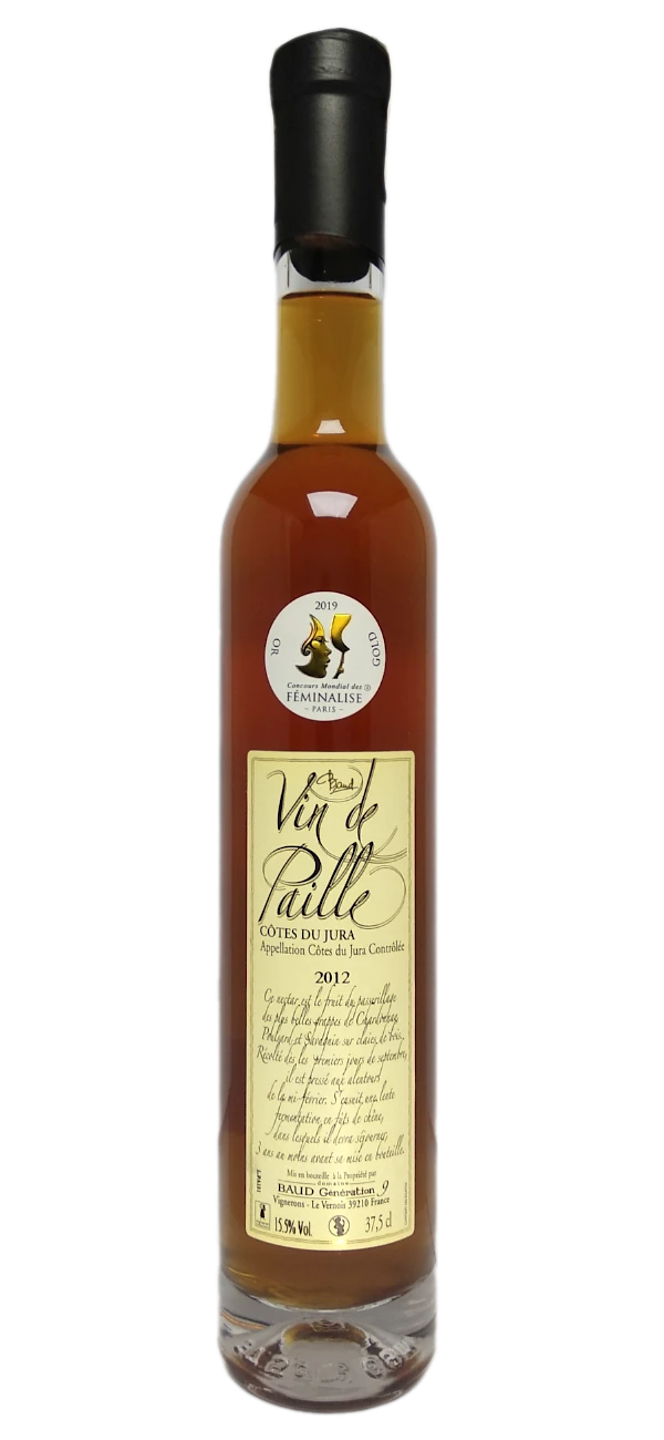 Domaine BAUD Vin de Paille 2012 to wyjątkowe słodkie wino z regionu Jura, wytwarzane metodą passerillage (suszenie winogron), typową dla apelacji Côtes du Jura. Winogrona szczepów Savagnin, Chardonnay, Poulsard są ręcznie zbierane, a następnie suszone przez kilka miesięcy, aby skoncentrować cukry i smaki. W efekcie powstaje wino o głębokich aromatach suszonej moreli, cytrusów i migdałów, z dodatkiem nut orzechów i nougatu. Na podniebieniu wyczuwalna jest świeżość, równowaga kwasowości oraz przyjemna mineralność. Wino dojrzewa w małych beczkach, co nadaje mu delikatne akcenty prażonych migdałów i orzechów laskowych. Rocznik 2012 uzyskał wysokie oceny za swoją złożoność i elegancję.